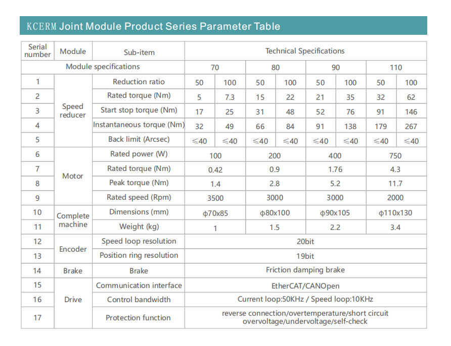 Product features The KCERM-R110 series products adopt photoelectric encoders and are equipped with brakes. It boasts extremely high precision and a compact structure, while also possessing an excellent hollow aperture, It can provide ample space for various cable routing needs.