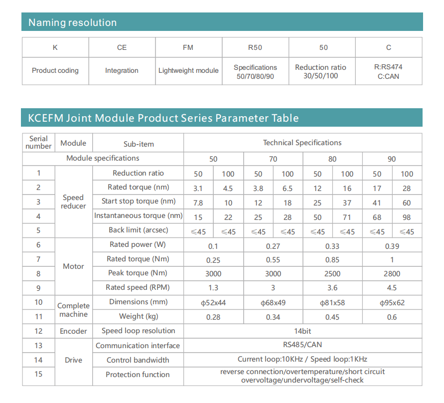 Product features The KCEFM-R50 series products adopt photoelectric encoders and are equipped with brakes. It boasts extremely high precision and a compact structure, while also possessing an excellent hollow aperture, It can provide ample space for various cable routing needs.
