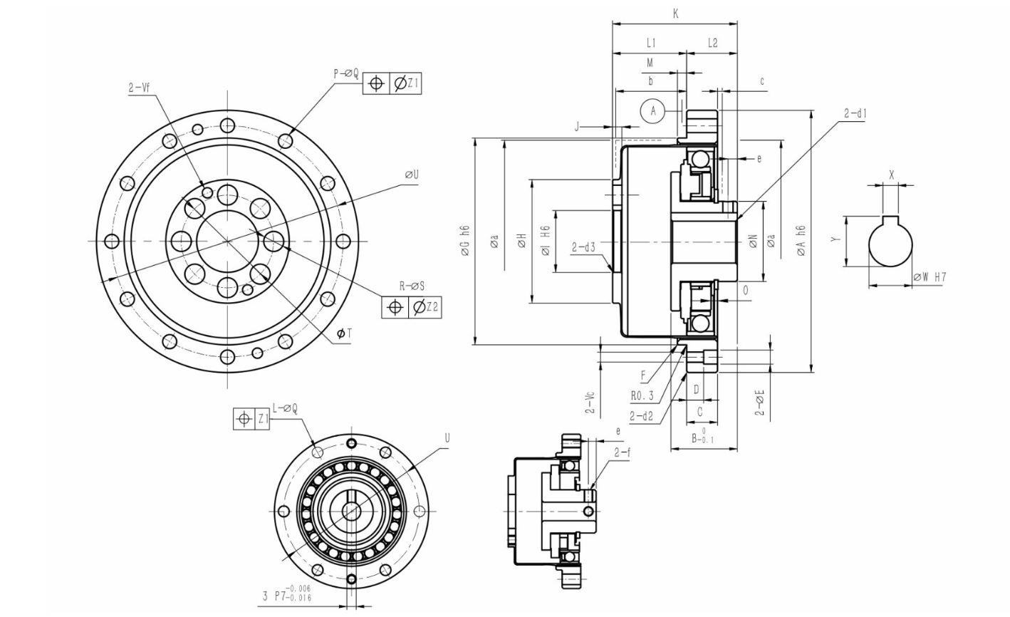 KMCG-A series consists of three basic components: flexible gear, rigid gear and wave generator. The flexible gear is a cup-shaped standard structure, and its input shaft directly cooperates with the inner hole of wave generator and connects with it through flat key or fastening screw.